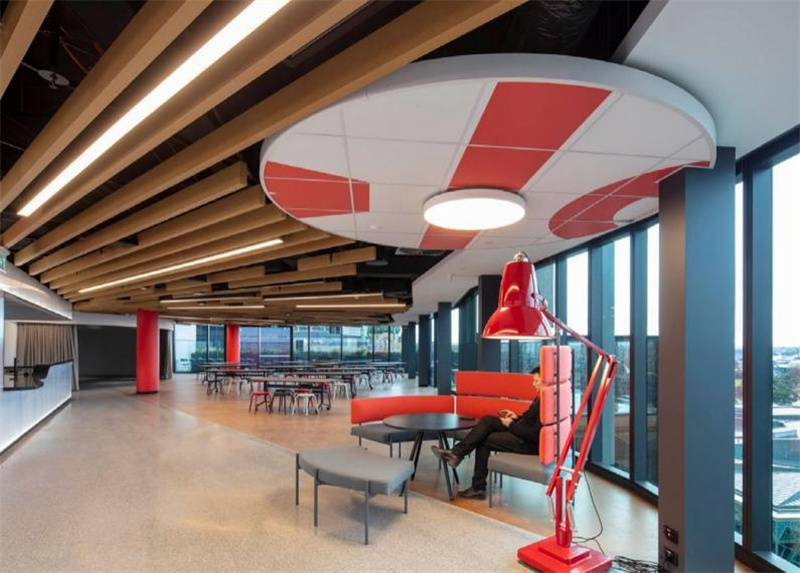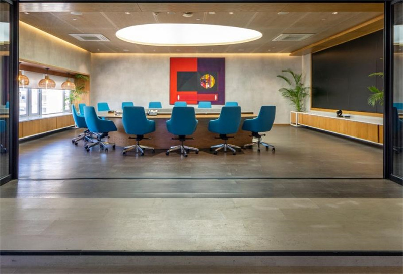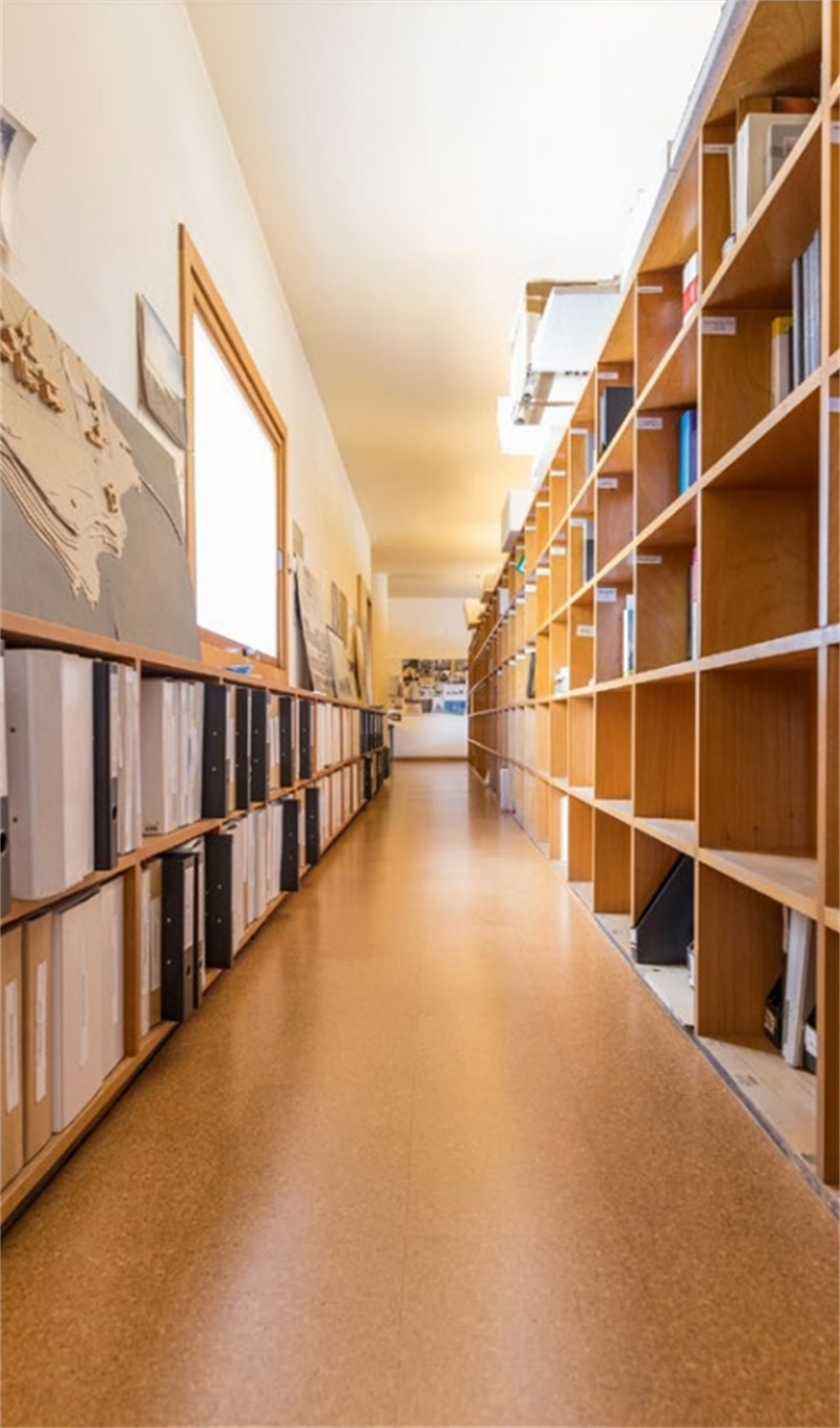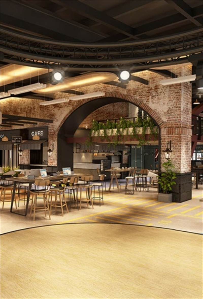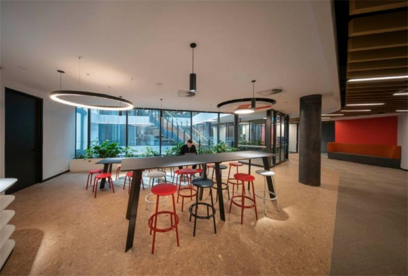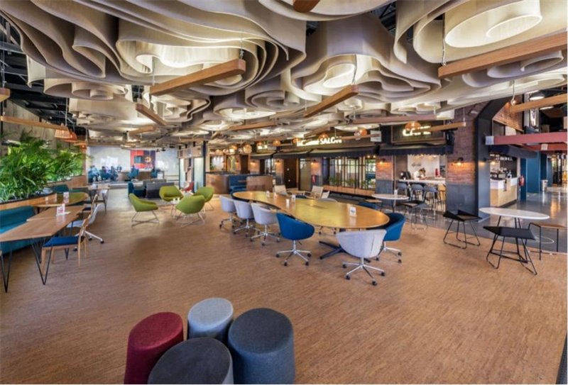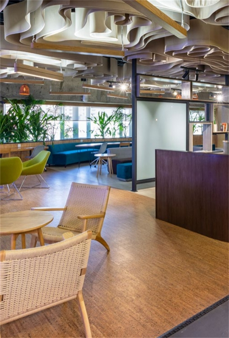 不规则的曲线吊顶、撞色的桌椅、复古的砖石还有明艳的绿植,如此复杂的设计氛围,软木地板却能巧妙的融入其中,给整个空间增添了沉稳恬静的质感。无论在此办公还是休憩,柔软舒适的脚感带给你轻松安宁的心境。
