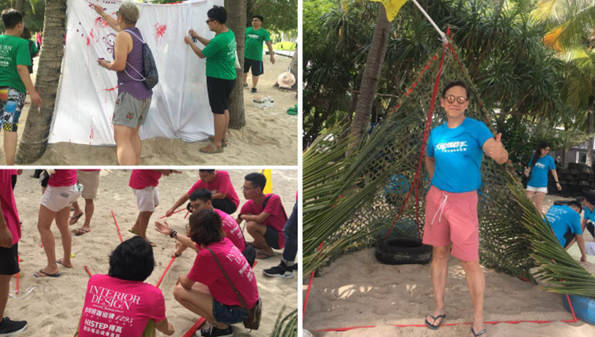 户外拓展环节有即兴设计、时装show 、挑战大海三个环节。来自全国各地的年轻选手和难得聚在一起的大咖们,组成红、黄、蓝、绿四个小组,发挥自身的想象与扎实的基本功底,通力协作,在游戏中增进交流、加深认识。